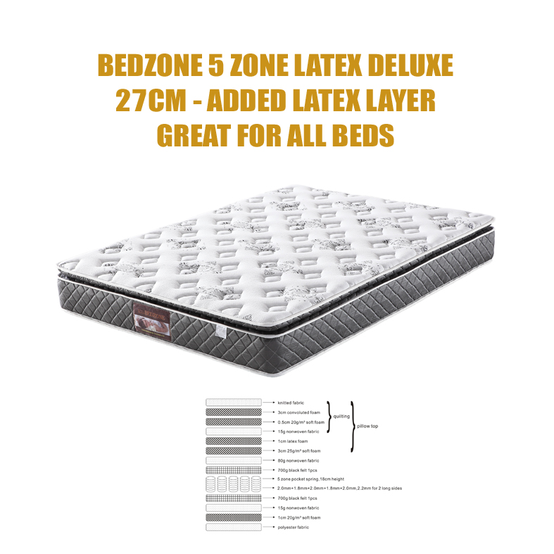 Bedzone Deluxe Five Zone Latex Pocket Spring Boxed Mattress features a no turn 5 zone pocket spring mattress with a Pillowtop. White knit Fabric with Natural Latex Layer. Medium Feel.